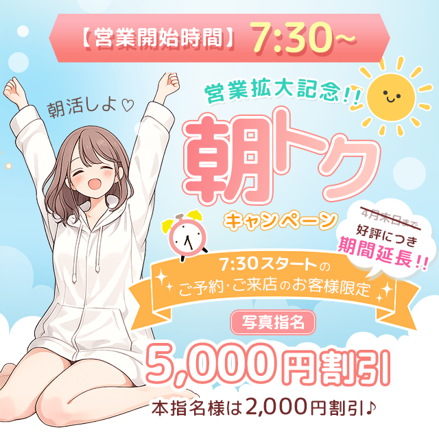 🌞🌞【営業拡大記念!!朝トクキャンペーン】🌞🌞 皆様お待たせいたしました!!! ついに4月18日(土)より \✨7:30~OPENスタート✨/ 営業拡大を記念して 朝だけ超お得なキャンペーン開催決定♪ ♡-----♡-----♡-----♡ キャンペーン内容 ♡-----♡-----♡-----♡ 朝7:30~ご予約・ご来店のお客様限定 ▶ 初めて指名する女の子 👉【5,000円割引】 ▶ 本指名のお客様 👉【2,000円割引】 ※朝限定の特典となります ♡-----♡-----♡-----♡ 開催期間 ♡-----♡-----♡-----♡ 4月18日~4月30日迄 朝の時間はゆったり遊べて 人気の女の子も狙いやすいおすすめの時間帯♪ さらに今だけ割引付きなので かなりお得にお楽しみいただけます♡ こちらのキャンペーンは 4月限定となりますので ぜひこの機会に “朝トク”しちゃってください♡ ※5月以降も営業時間は【7:30~】となります🌞 ♡-----♡-----♡-----♡-----♡-----♡-----♡-----♡
